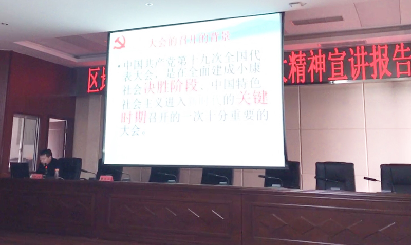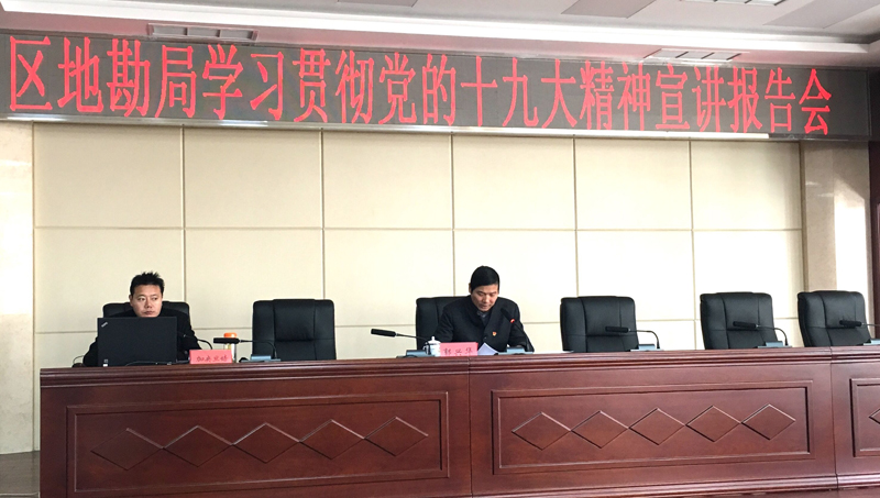 为深入推进学习贯彻落实党的十九大精神,11月24日上午,西藏地勘局邀请自治区党的十九大精神宣讲团成员、区农牧厅机关党委副书记、纪委书记、青年工作委员会主任加央旦培同志作党的十九大精神宣讲辅导。会议由局党委委员、副局长郭兴华主持,局属各单位副处级以上领导干部、各党支部书记、各部门负责人,机关全体干部职工约150人参加学习。