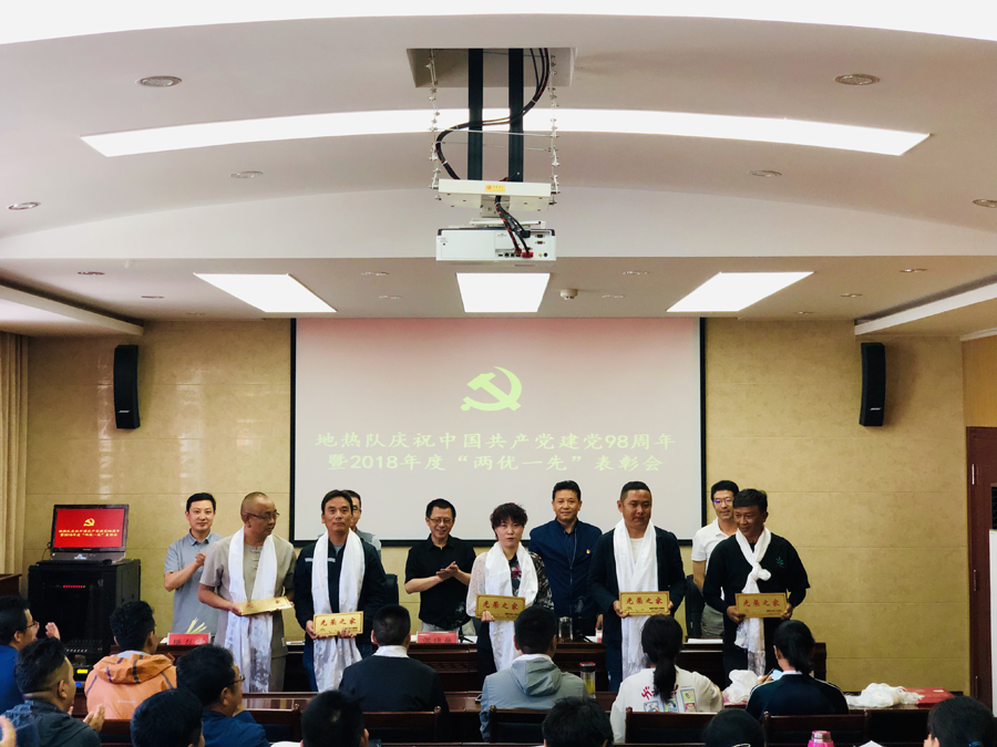 地热队党委结合“不忘初心、牢记使命”主题教育活动,召开庆祝中国共产党建党九十八周年暨2018年度“两优一先”表彰会新党员入党宣誓、全体党员重温入党誓词。会议专门举行退役军人颁发“光荣之家”荣誉牌匾仪式,向退役军人家庭致以诚挚慰问和崇高敬意弘扬拥军优属优良传统,营造尊重尊崇军队退役人员的良好氛围。