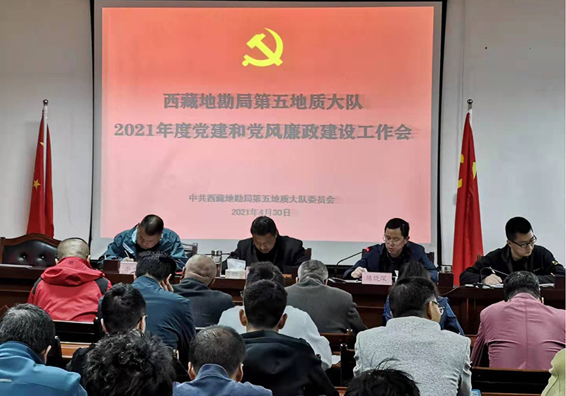 2021年4月30日上午,地质五队召开2021年党建和党风廉政建设及意识形态工作会议。会议由队党委委员、纪委书记张彦军主持,队党委书记、队长达瓦穷达,队党委委员、总工程师陈晓深,队党委委员、副队长李玉昌出席会议。在队全体干部职工参加会议。