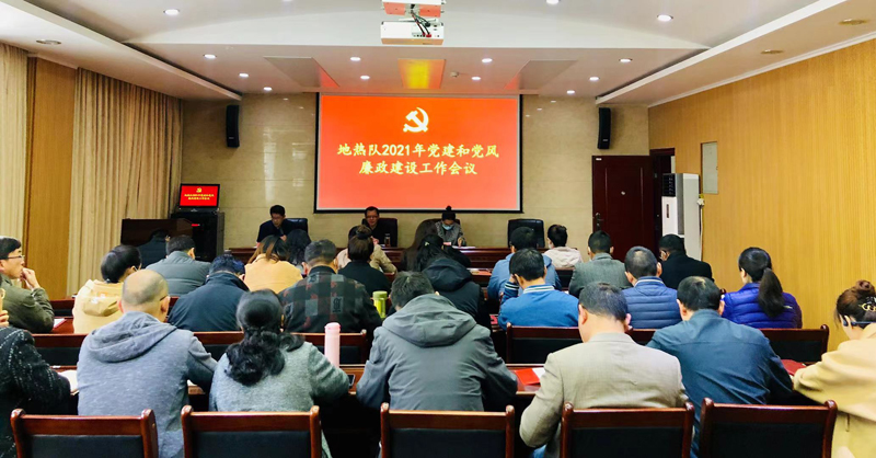 2021年5月8日上午,地热队召开2021年党建和党风廉政建设工作会议。区地勘局政工人事处副处长春兰莅临会议指导。会议由队党委委员、总工程师荣峰主持,队党委书记、副队长郭建慈和副科级以上党员干部、党支部委员、党员代表参加会议,团支部代表、群众代表列席会议。