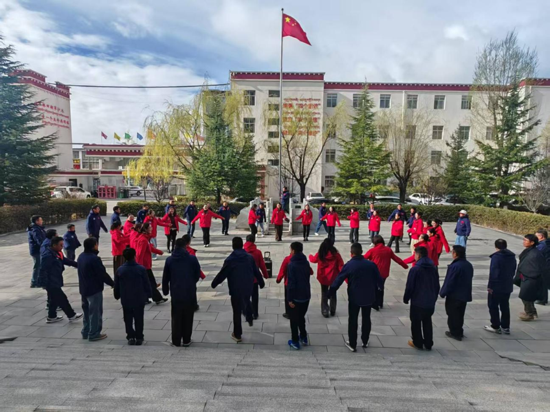 升旗仪式结束后,现场开展了富有民族特色的集体跳锅庄活动。大家围成一圈,伴随着欢快的节奏,踏着轻盈的步伐,共同跳起热情洋溢的锅庄舞。现场气氛热烈祥和,充分展现了地质三队干部职工手足相亲、守望相助的深厚情谊,生动诠释了中华民族一家亲的温暖画面。
