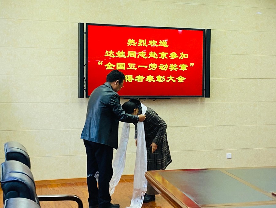 会后,局领导及地热队党委班子成员一一为达娃同志献上洁白的哈达,向她表示衷心的祝贺,祝愿她赴北京领奖一路平安,载誉而归。
