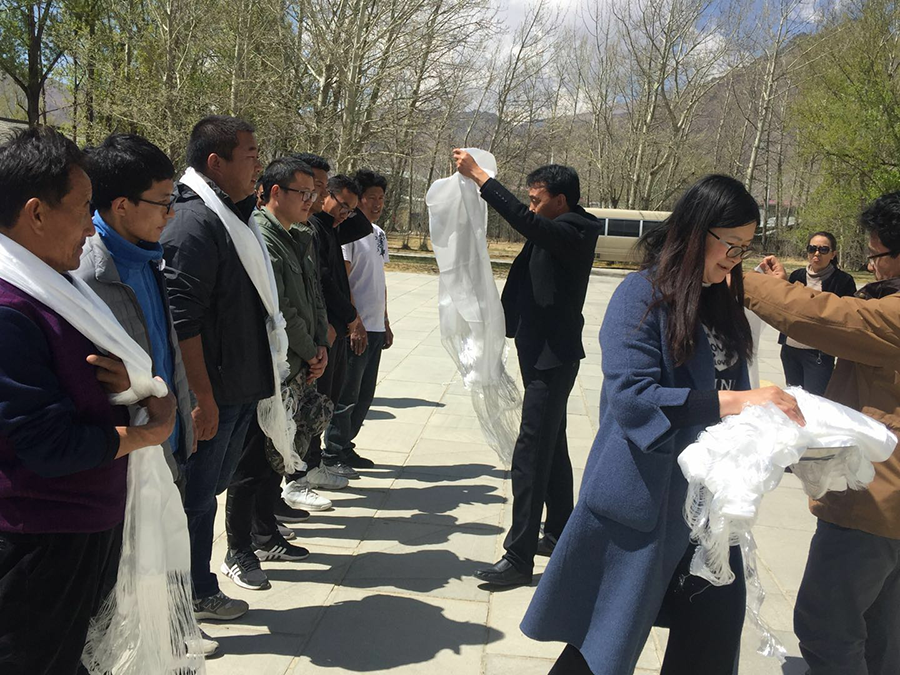出队仪式上,扎西队长与项目组成员一一握手并献上洁白的哈达,叮嘱大家在野外开展项目工作的同时,要提高安全意识,继承和发扬地质“三光荣”优良传统,加强团结,切实抓好项目实施和项目质量管理工作,保质保量完成2019年工作任务,以优异的成绩向中华人民共和国成立70周年献礼。