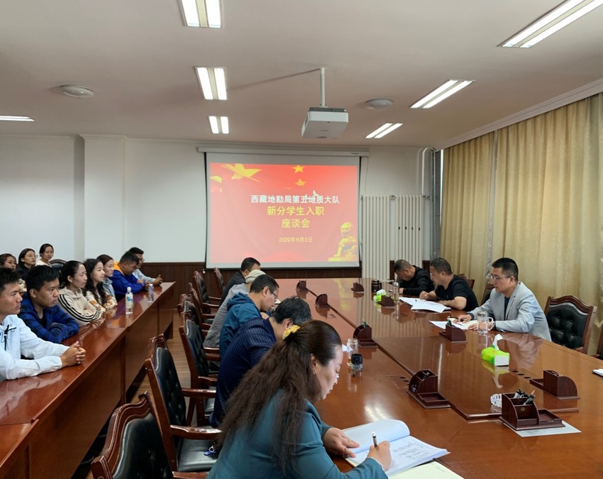 按照地质五队2020年度的人才需求计划,13名新分配学生通过2020年区直事业单位公开招聘考试入职单位。队党委高度重视,为了让新同事尽快了解单位的基本情况,找准自身工作定位,快速融入单位文化价值理念,于2020年9月3日召开2020年度新分学生入职座谈会。队党委书记兼队长达瓦穷达、副队长李玉昌、纪委书记张彦军、总工程师陈晓深以及相关科室负责人参加座谈。