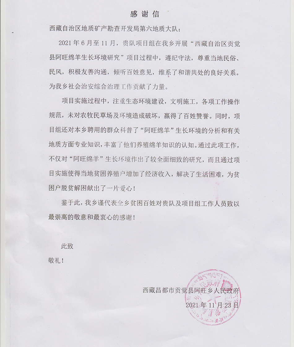 为响应西藏“品牌兴农兴牧”计划战略,充分发挥“五型地勘”在建设新时代新西藏重要意义,地质六队承担的局管资金项目“西藏自治区贡觉县阿旺绵羊生长环境研究”项目在实施过程中注重生态环境保护,文明施工,赢得了当地群众的赞誉,得到了贡觉县阿旺乡人民政府感谢。