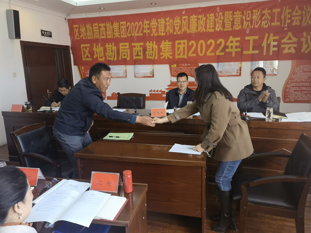会上,公司领导班子传达学习了区地勘局2022年党建和党风廉政建设暨意识形态工作会议和2022年工作会议精神。党总支书记、总经理米玛顿珠分别作党建和党风廉政建设工作报告、意识形态工作报告及经济工作报告,总结2021年各项工作取得的成绩,安排部署2022年各项工作。并对2021年度综合治理和安全生产先进单位进行了表彰,与部门代表签订了西勘集团2022年社会治安综合治理、安全生产和党风廉政建设等系列目标责任书。