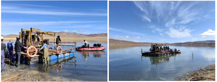 八乌错所在地多为盐碱、湖沼堆积,每年七、八月份为雨季,十月至翌年五月为冰冻期,仅六月至九月气候适合野外工作。但由于立项时间等因素,现只能在冬季施工,目前湖面已结冰,船只无法正常通行。面对极寒天气、技术、装备、安全等多方面的重大挑战,项目组艰苦创新,利用塑料油桶及钢管搭建平台,螺旋桨作为驱动组装成简易破冰和运输工具,用实际行动诠释“老西藏精神”,严格落实“三防两保”,力保此次冬季生产安全有序、保质保量地完成。