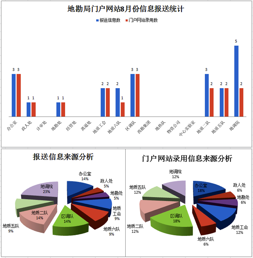 《西藏地勘局信息报送制度(试行)》8月1日试行以来,得到局机关各处室和局属各单位的大力支持。统计显示,8月份各处室(单位)总计上报信息22篇,门户网站收录17篇,采用率77%,上报稿件质量良好(详见图表分析)。