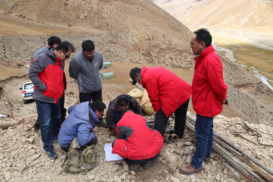 局长王衍彪、副局长杜光伟先到项目驻地对工作人员进行慰问,然后听取项目组就项目概况、进展、取得的成果、下一步工作安排等情况的汇报,接着在项目组的带领下驱车翻越海拔5800米的山峰来到无巴多来矿区。在矿区进行简单的就餐后,王衍彪局长一行徒步来到钻机工作机台(ZK001),实地仔细查看了项目生产工作情况,并检查了项目地质填图实际材料图、钻探岩芯等,对项目人员的工作给予了肯定,指出该矿区地质构造环境复杂,成矿条件优越,有望在做好地质基础工作的基础上寻找斑岩型铜矿,实现找矿突破。王衍彪局长强调:一是要增强安全意识,严格按照《地质勘探安全规程》,遵守各项安全规章制度,不管何时何地,都要确保安全生产、绿色生产,保障野外生产顺利进行;二是追赶施工进度,并且在保证施工进度的同时,要注重野外工作质量和成果;三是进一步加强观察、对钻孔岩芯的岩性、脉体、蚀变、矿化等变化进行认真的编录,做好样品采集和实验测试、分析工作;四是对项目原始资料进一步补充、修改、完善,同时将目前取得的成果与已知相似矿床进行对比,结合区域相关资料加强综合研究等,以便更好的指导以后的地质找矿工作;五是野外工作环境及生活条件十分艰苦,对施工进度、作业质量以及安全标准等也有很高要求,希望大家发挥多年来积累的丰富经验,克服困难,科学管理,争取安全、优质、高效地完成项目工作,力争实现找矿突破。