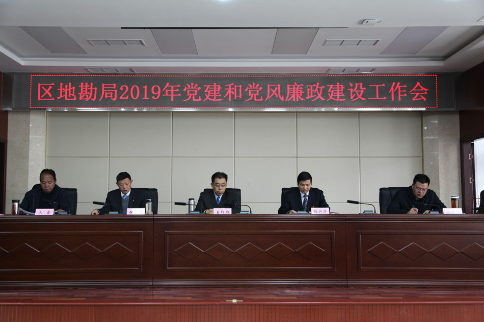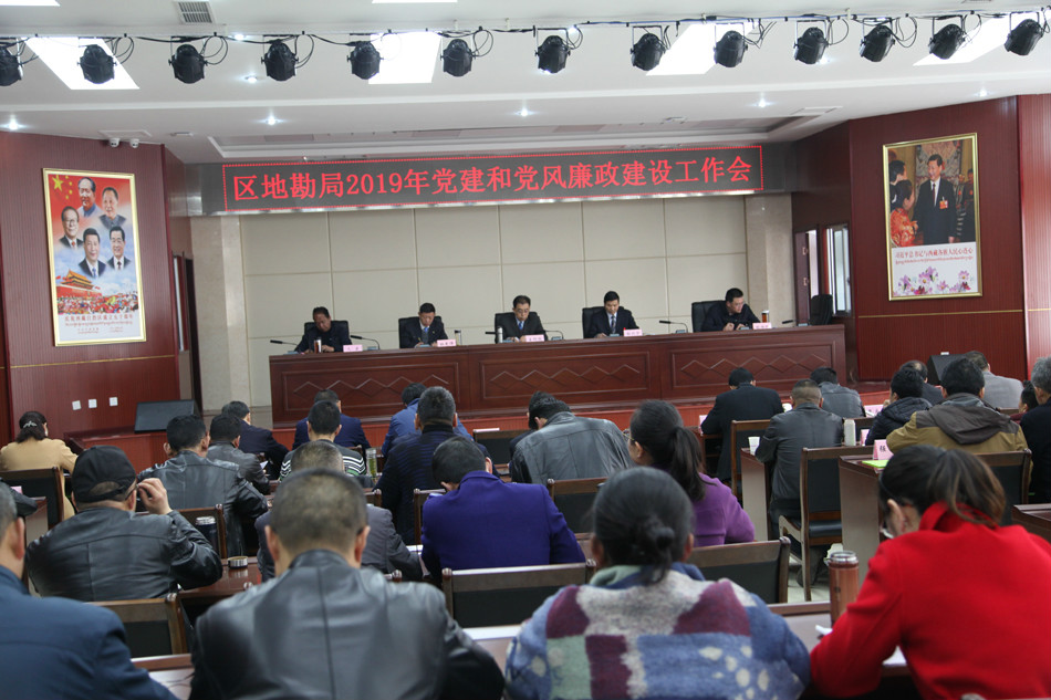 2019年4月17日,区地勘局召开2019年党建和党风廉政建设工作会议。会议由局党委委员、副局长郭兴华主持,局党委副书记、局长王衍彪和自然资源厅纪检监察组副组长久桑作了重要讲话,局党委委员、副局长杜光伟、张焕彬分别传达十九届中央纪委第三次全会和区纪委九届四次全会精神。全局副处级以上干部和局属单位主要部门及项目负责人以及局机关全体干部职工共计119人参加或列席会议。