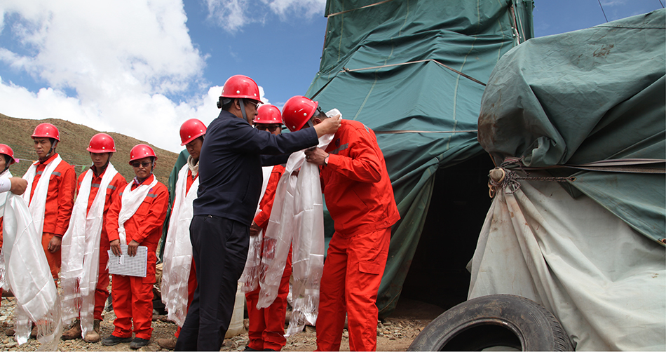 走出钻井平台,巴桑书记和谢渊副局长为坚守平台的干部职工和钻井工人敬献哈达并合影留念,同时予以诚挚问候,叮嘱一定要保重身体,注意安全。
