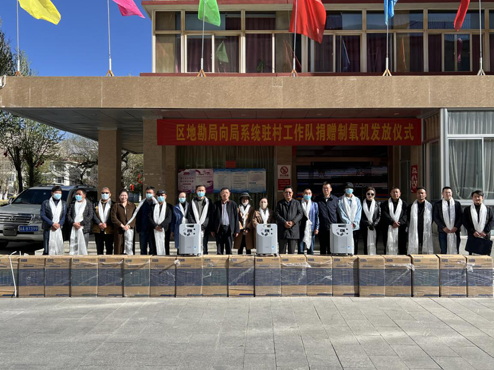 区地勘局系统共有19个驻村点,位于那曲市、日喀则市的19个行政村、驻地海拔最高达5020米,平均海拔4500米以上。局党组历来高度重视广大驻村队员的身体健康,长期以来为大家创造了良好的生活条件,为进一步关心关爱驻村队员解决驻村队员在高海拔地区的缺氧问题,3月30日,地勘局党组举行向局系统驻村工作队捐赠制氧机发放仪式。