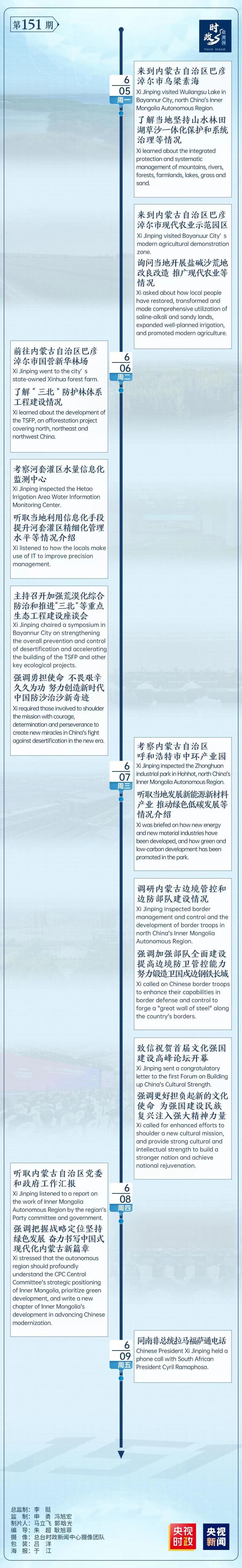 6月07日,习近平总书记考察内蒙古自治区呼和浩特市中环产业园,听取当地发展新能源新材料产业,推动绿色低碳发展等情况介绍;调研内蒙古边境管控和边防部队建设情况,强调:加强部队全面建设,提高边境防卫管控能力,努力锻造卫国戍边钢铁长城;致信祝贺首届文化强国建设高峰论坛开幕,强调:更好担负起新的文化使命,为强国建设民族复兴注入强大精神力量。
