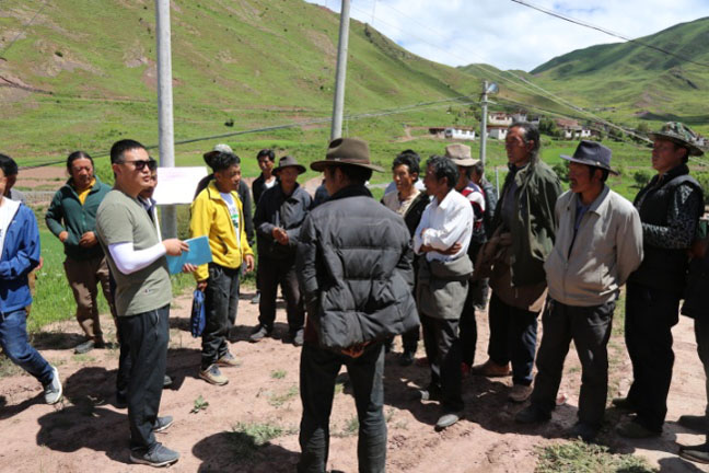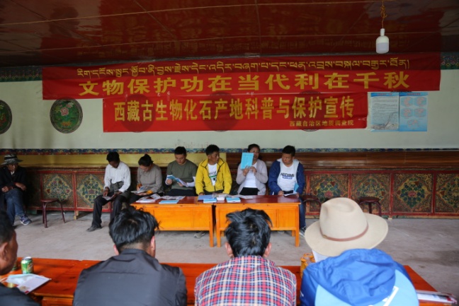 宣传活动由昌都市卡若区文化局干事向巴巴措主持。项目组成员用藏语形象生动的讲述恐龙化石的形成和演化历史,科普《西藏古生物化石保护与管理法规文件与汇编》和《西藏古生物化石宣传册》相关内容,阐述恐龙化石产地的科学价值、稀有价值和保护意义,使当地群众对恐龙化石有了初步认识,增强了他们地质遗迹保护意识,为今后保护与开发昌都恐龙化石遗迹资源奠定了基础。宣讲结束后,卡若区文化局同志、当地村民和项目组成员,共同在达玛拉山恐龙化石产地举行了“警示牌”树牌仪式。