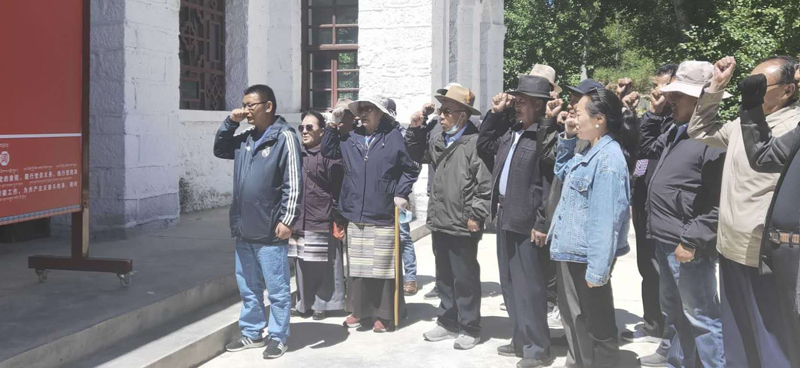 在农场礼堂前,老同志们又一次坚定而庄严地举起了右手,在拉萨站负责人米玛次仁的领誓下重温了入党誓词。