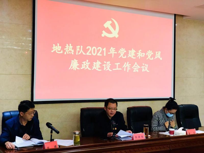 2021年5月8日上午,地热队召开2021年党建和党风廉政建设工作会议。区地勘局政工人事处副处长春兰莅临会议指导。会议由队党委委员、总工程师荣峰主持,队党委书记、副队长郭建慈和副科级以上党员干部、党支部委员、党员代表参加会议,团支部代表、群众代表列席会议。