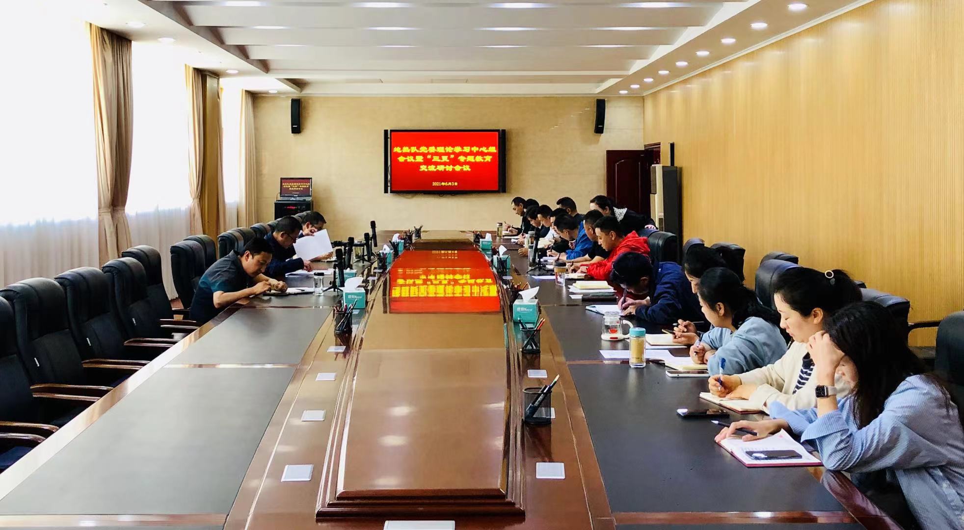 2021年6月3日下午,地热队党委召开理论学习中心组会议暨“三更”专题教育交流研讨会议。队党委书记、副队长郭建慈主持会议,在队党委班子成员、中层干部、各党支部支委参加了学习会议。