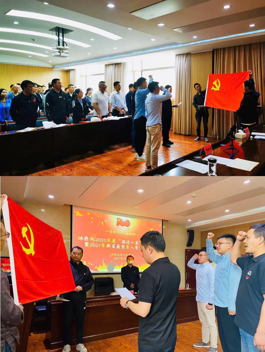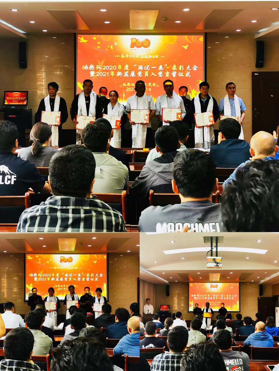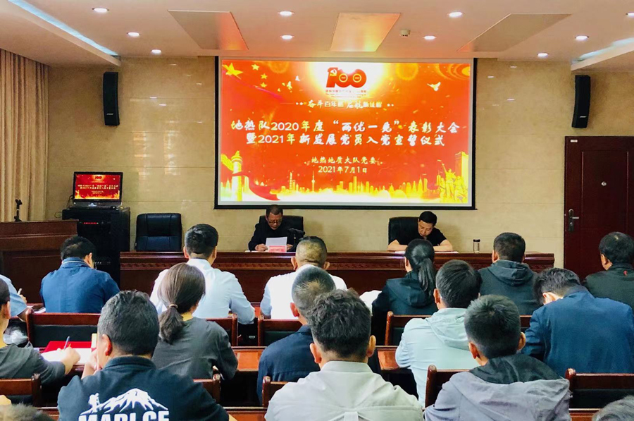 值此中国共产党成立100周年之际,地热队召开2020年度“两优一先”表彰大会暨2021年新发展党员入党宣誓仪式,队党委书记、副队长郭建慈,队党委委员、副队长樊磊磊出席大会,在队党员、团员青年、群众代表参加大会。