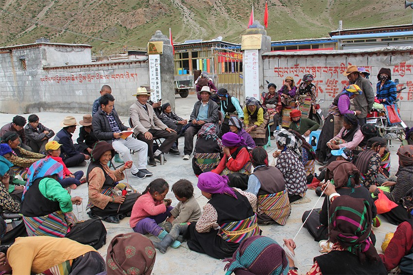 为总结“四讲四爱”第一节点“讲党恩 爱核心”宣讲活动取得的成果、经验、好做法,确保 “四讲四爱”第二节点“讲团结 爱祖国”宣讲活动顺利开展,7月28日,区地勘局机关驻许如村工作队组织群众召开“四讲四爱”第一节点“讲党恩 爱核心”宣讲活动总结会暨第二节点“讲团结 爱祖国”宣讲活动动员会。会议由驻村工作队副队长顿珠主持。村“两委”班子、驻村工作队、全村75户家庭代表共80余人参加会议。