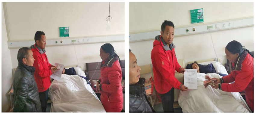 近日,西勘集团党总支书记李全文、副总经理普布占堆及驻村工作队队长代表公司党总支委员会前往自治区人民医院看望因病住院的驻村工作点建档立卡户多加的女儿巴桑央吉,将社会各界爱心人士筹集的善款22811.66元交至患者母亲手中,并鼓励巴桑央吉要坚强,积极协助医护人员同疾病作斗争,以便早日康复。巴桑央吉一家感谢公司领导及社会爱心人士,表示一定会坚强渡过难关,争取早日康复,回家努力干活,早日脱贫摘帽。