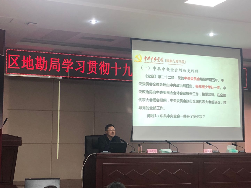 11月29日下午,为使区地勘系统干部职工准确领会把握党的十九届四中全会精神,推动全会精神在地勘局落地落实,根据区党委宣传部统一安排部署,地勘局邀请自治区党的十九届四中全会精神宣讲团副团长、区党委党校(行政学院)副校长万代玺为干部职工作宣讲报告。会议由局党委副书记、副局长、机关党委书记杨安文主持,局属各单位、机关110余名干部职工参加了学习。