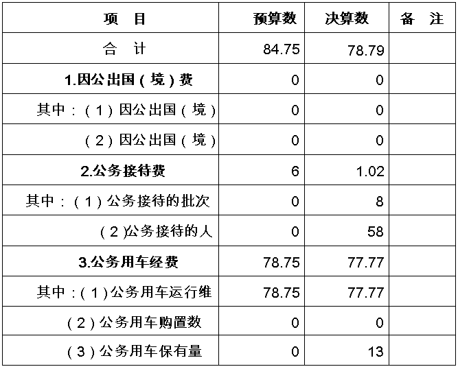 2、对因公出国(境)团组数及人数均为0元,公务用车购置数0辆,公务用车保有量13辆,国内公务接待的批次8次、公务接待人次58人。