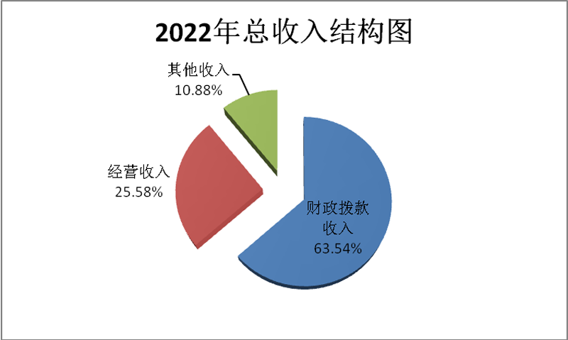 2022年决算总收入为1001.57万元,其中:财政拨款收入636.41万元,占总收入的63.54%;经营收入256.17万元,占总收入的25.58%;其他收入108.99万元,占总收入的10.88%。说明对财政拨款收入的依存度较大。较比2021年度决算总收入1326.83万元,减少325.26万元,减少率24.51%。主要原因:2022年财政拨款项目减少;其他收入也明显减少。