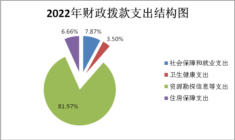 2022年度财政拨款支出692.87万元,主要用于以下方面:社会保障和就业支出54.50万元,占总支出的7.87%;卫生健康支出24.27万元,占总支出的3.50%;资源勘探信息等支出567.94万元,占总支出的81.97%;住房保障支出46.17万元,占总支出的6.66%。