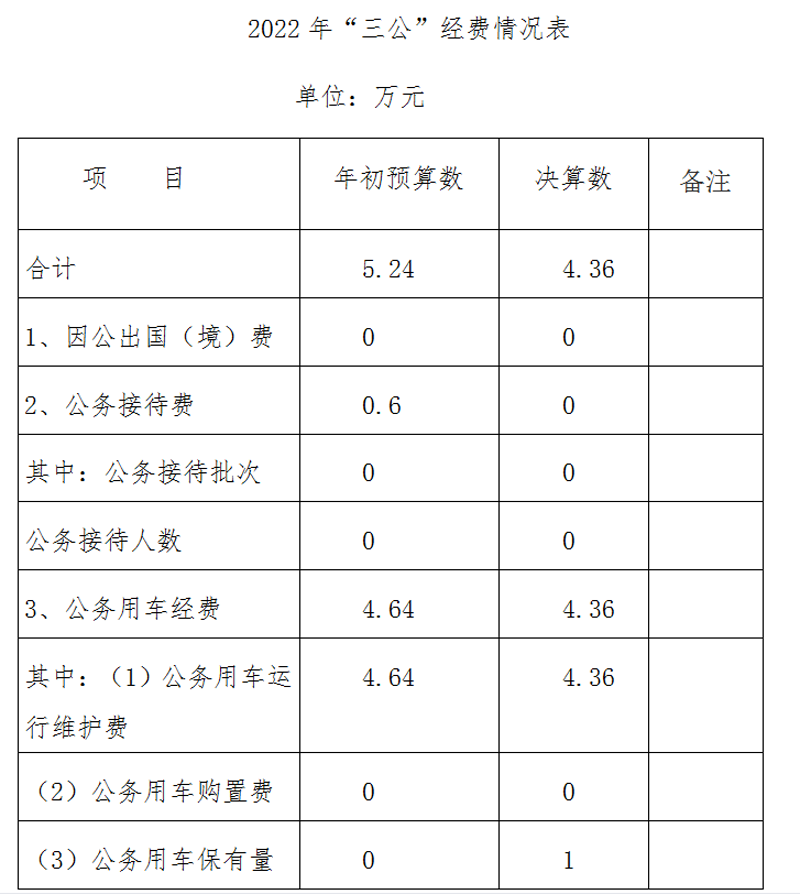2、2022年未产生公务接待费。公务用车经费4.36万元,为公务用车运行维护费4.23万元,未产生公务用车购置费,公务用车保有量1辆。