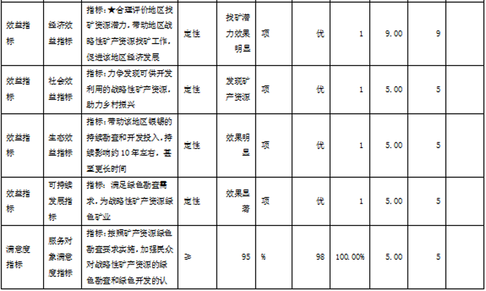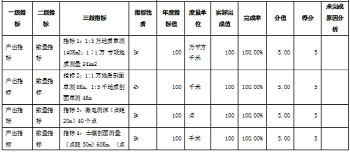 地质调查评价项目绩效自评报告:根据年初设定的绩效目标,项目绩效自评得分为100分。全年预算数为192.00万元,执行数为191.08万元,完成预算的99.52%。项目绩效目标完成情况:完成年度目标。