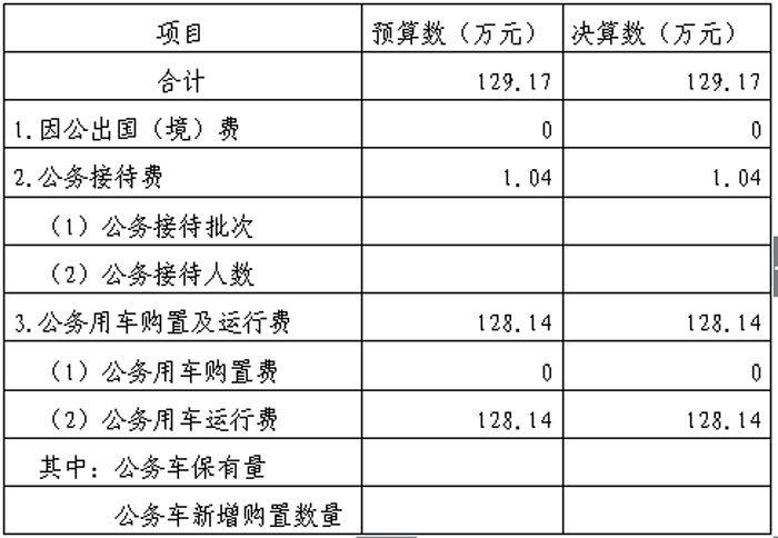 2024年度财政拨款“三公”经费支出决算129.17万元,无因公出国(境)费支出;公务用车购置及运行维护费支出决算128.14万元,占99.20%;公务接待费支出决算1.04万元,占0.8%。其中: