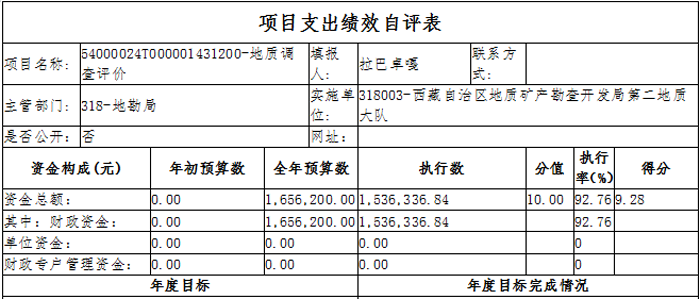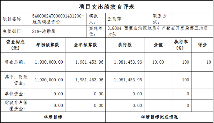 我局在部门决算中反映西藏仲巴县-改则县天公尼勒地区1∶5万地质矿产调查项目、地质调查评价项目等2个项目绩效自评结果。