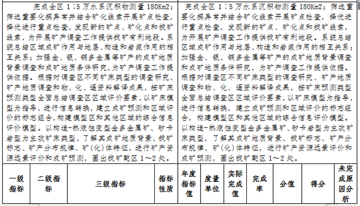 项目绩效目标完成情况:完成全区1∶5万水系沉积物测量220Km2;筛选重要化探异常并结合矿化线索开展矿点检查,择优进行重点检查,发现新的矿点、矿化点和找矿线索,为开展矿产调查工作提供找矿有利地段。系统总结区域成矿作用与地层、构造和岩浆作用的相互关系;加强金、银、铜多金属等矿产的成矿地质背景调查和成矿地质条件研究,为矿产调查工作提供依据。根据对调查区不同矿床类型的调查研究、矿产地质调查和物、化、遥资料解译成果,按矿床预测类型全面总结调查区区域评价要素,以矿床模型为指导,进行信息转换,建立成矿预测和区域评价的标志组合,构建模型区和其他区域的综合信息评价模型。以构造-热液蚀变型金多金属矿、矽卡岩型为主攻矿床类型,了解其成矿地质背景、找矿标志、矿产分布规律、矿(化)体特征,进行矿产资源远景评价和成矿预测,圈出找矿靶区1~2处。