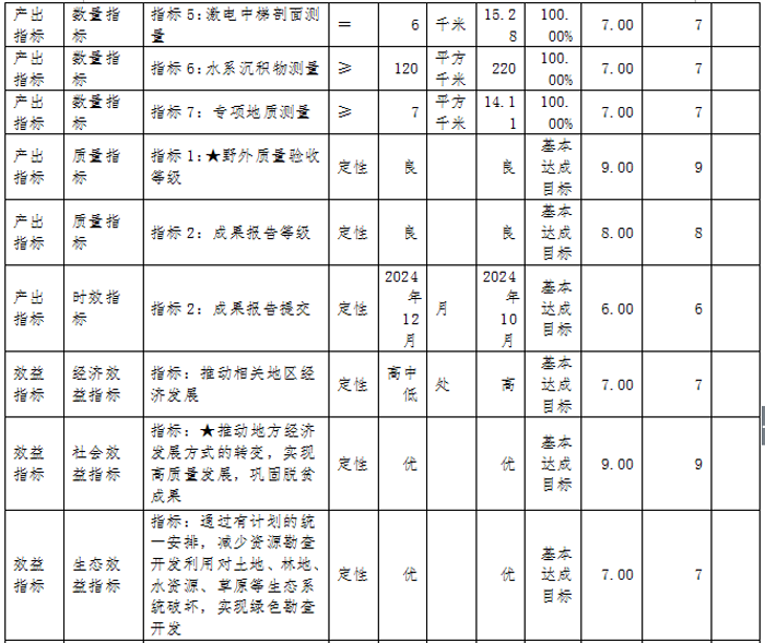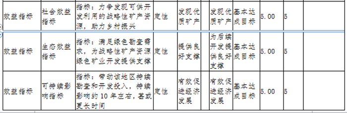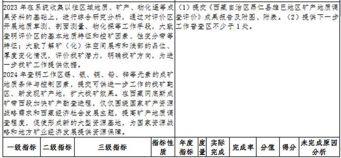 项目绩效目标完成情况:2023年开展了项目野外地质工作,全部完成了项目设计的野外主要实物工作量,年度资金执行率92.76%,得分9.28分,绩效目标指标得分97.83分。该项目成果报告已编制完成并完成评审工作,项目经济、社会、环境效益等得以全部体现。