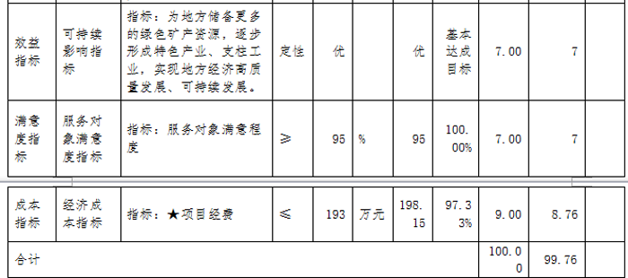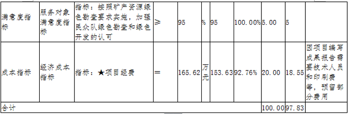 地质调查评价项目绩效自评报告:根据年初设定的绩效目标,项目绩效自评得分为97.83分。全年预算数为165.62万元,执行数为153.63万元,完成预算的92.76%。