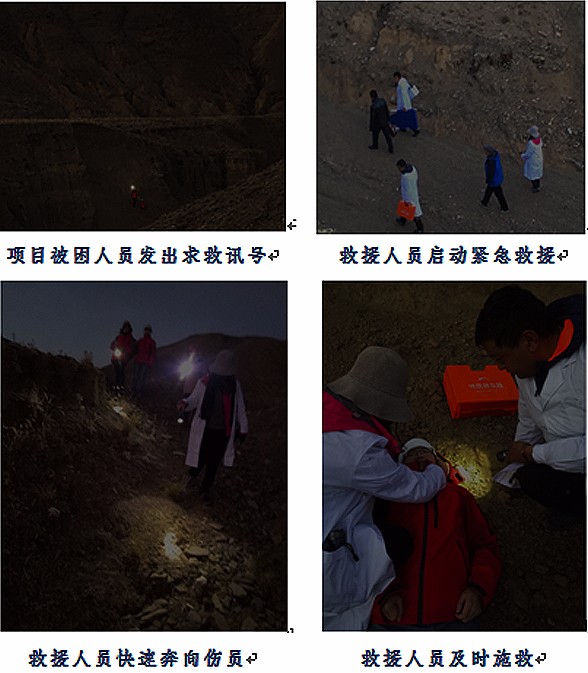 按照应急救援方案,21日19点35分,假想项目组人员突遇泥石流“险情”受伤拨打求救电话,演练总指挥孟民民接到求救电话了解情况后,迅速集合队伍,下达救援指令,救援组及时展开夜间搜寻救援活动。重点演练了救援工作人员面对夜间视野受限、地形陌生、低温寒冷等一系列困难时开展夜间野外应急救援的能力。