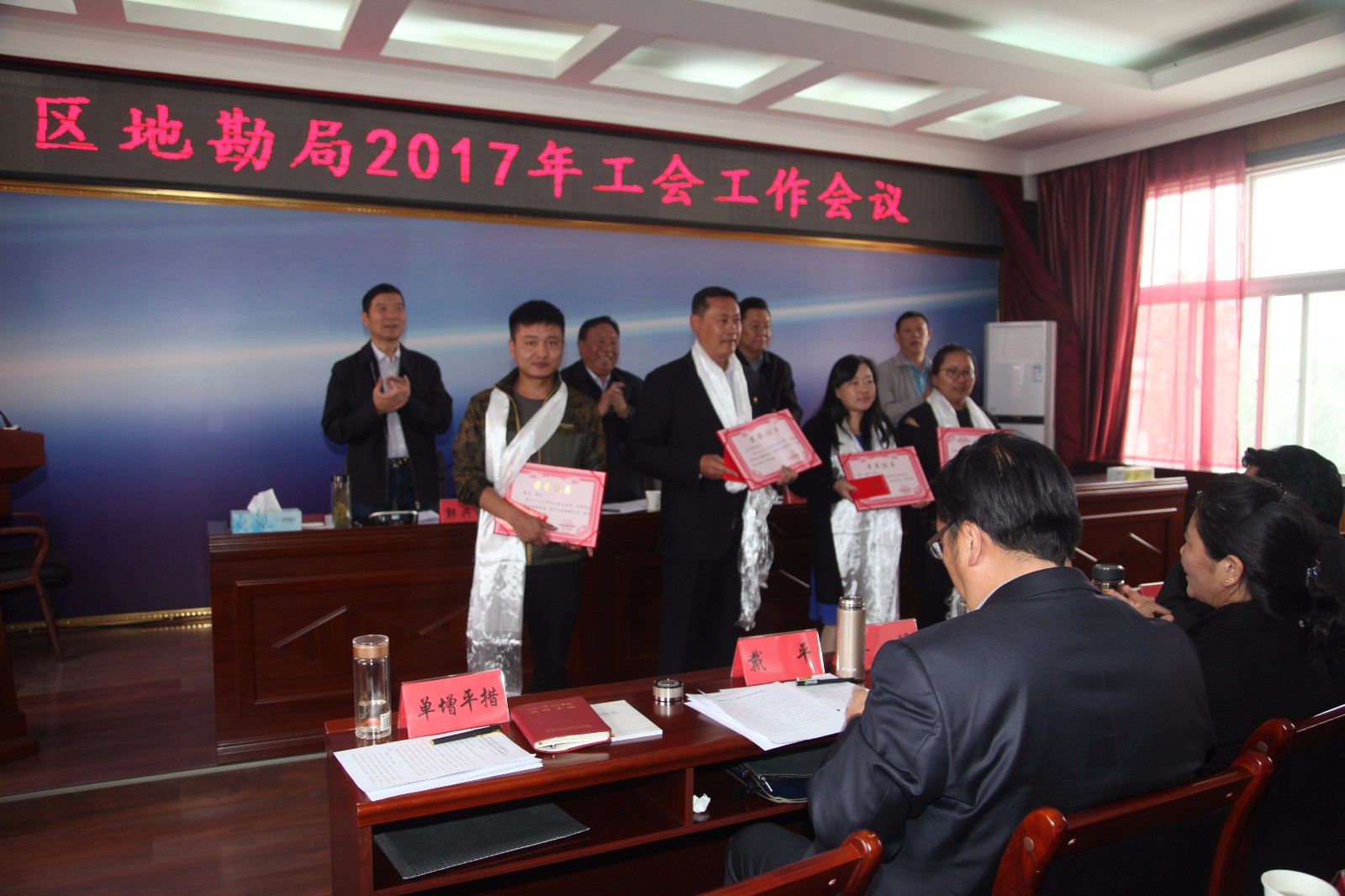 自治区总工会党组成员、副主席边巴出席并作指导讲话,区地勘局党委书记、副局长巴桑出席并作讲话,区地勘局党委委员、副局长郭兴华主持会议并作总结讲话,区地勘局党委委员、副局长杜光伟参加大会,区地勘局工会副主席单增平措代表西藏地质工会做工作报告。
